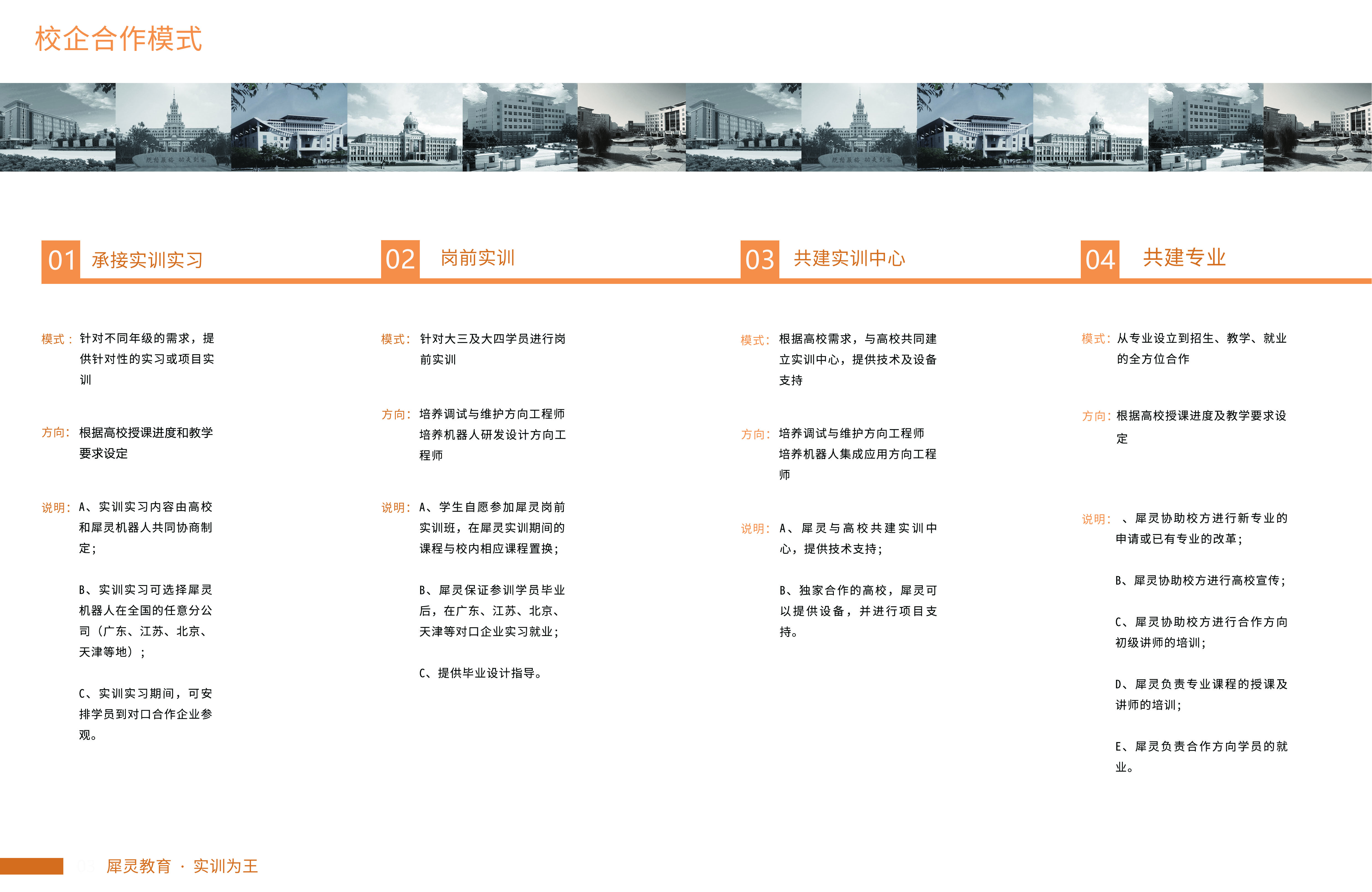 犀靈機(jī)器人秉承“互利共嬴”的宗旨和“共建精品專業(yè)”的教育與產(chǎn)業(yè)整合理念,推行校企合作的人才培養(yǎng)模式。在校企合作方面,犀靈機(jī)器人與校方發(fā)揮各自優(yōu)勢(shì),聯(lián)合培養(yǎng)高新技術(shù)綜合型人才;在專業(yè)共建方面,犀靈機(jī)器人與國(guó)內(nèi)本、專科以及職業(yè)院校共建包括工業(yè)機(jī)器人技術(shù)專業(yè)、機(jī)器視覺(jué)專業(yè)等在內(nèi)的專業(yè)體系,涵蓋人才培養(yǎng)方案設(shè)計(jì)、課程體系建設(shè)、實(shí)訓(xùn)體系建設(shè)、師資隊(duì)伍建設(shè)、學(xué)生實(shí)習(xí)就業(yè)、配套基礎(chǔ)建設(shè)等方面合作;同時(shí),在保障學(xué)生優(yōu)質(zhì)化就業(yè)的前提下,犀靈機(jī)器人創(chuàng)新性的提出“項(xiàng)目導(dǎo)向制教學(xué)”、“以就業(yè)為導(dǎo)向的實(shí)踐教學(xué)”、“教學(xué)安排基于行業(yè)崗位標(biāo)準(zhǔn)”、“線上線下混合式教學(xué)模式”等符合現(xiàn)代職業(yè)教育發(fā)展的教學(xué)理念,并貫穿應(yīng)用在學(xué)生教學(xué)、學(xué)生管理、實(shí)訓(xùn)實(shí)習(xí)的全過(guò)程。