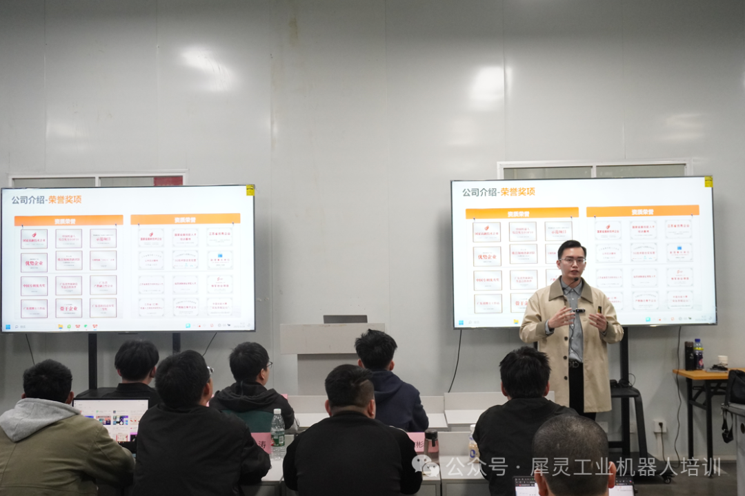 課程開(kāi)啟后,“大班理論 + 小班實(shí)操” 的優(yōu)勢(shì)充分顯現(xiàn)。理論課堂上,講師借助雙屏展示企業(yè)榮譽(yù)、技術(shù)案例,結(jié)合行業(yè)前沿動(dòng)態(tài),構(gòu)建起完整的知識(shí)體系。從機(jī)器人基礎(chǔ)原理到自動(dòng)化項(xiàng)目設(shè)計(jì)邏輯,學(xué)員們專注記錄、積極互動(dòng),思維在專業(yè)知識(shí)的碰撞中不斷升級(jí)。