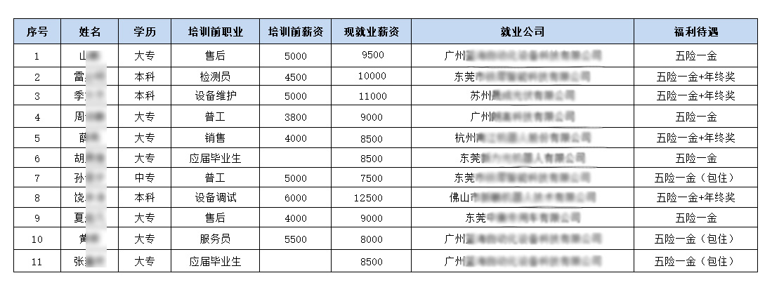 第6期學員2017年11.12號畢業(yè),共11位學員,截止2019年3.1日,平均薪金為9272元,最讓人振奮的是他們居然100%還在從事著與工業(yè)機器人相關的工作。
