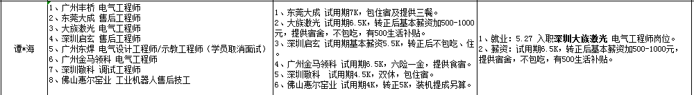 譚*海同學(xué),24歲,湖南理工學(xué)院機(jī)電一體化本科畢業(yè),工作經(jīng)驗(yàn)一年。本次他共面試了8家企業(yè),被其中6家企業(yè)錄取,經(jīng)過考慮他選擇了大族激光電氣工程師一職,轉(zhuǎn)正工資7500元,并有500元生活補(bǔ)貼,出差及加班費(fèi)另算。