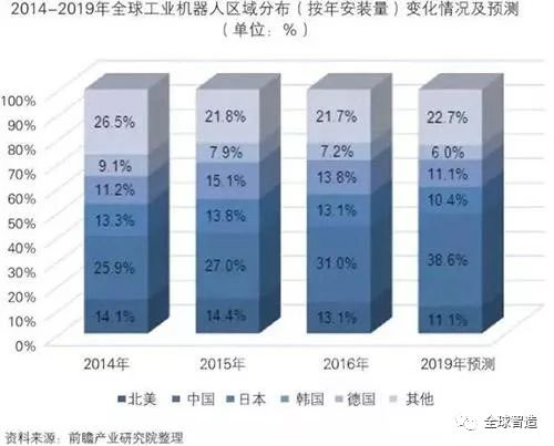 從全球工業(yè)機器人的年安裝量變化情況來看,據(jù)IFR的統(tǒng)計,2016年中國安裝量占比提升至31.0%,北美、日本、韓國和德國的安裝量比重略有下滑。整體來看,2016年亞太地區(qū)依然是工業(yè)機器人安裝量增量最大的市場。據(jù)IFR的預測,到2019年,中國安裝量比重將進一步上升至38.6%。