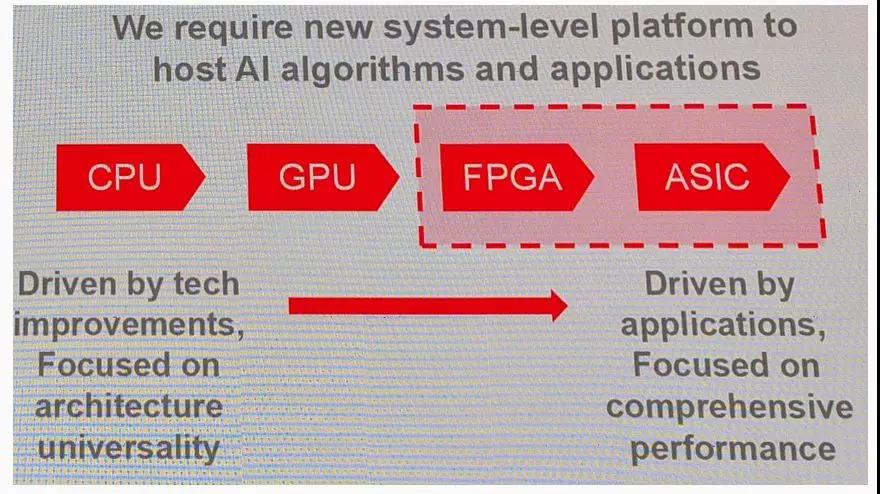 計算芯片工藝從過去28納米、20納米, 16納米,14納米、10納米、7納米、5納米、3納米,摩爾定律使芯片性能增加速度越來越飽和。大家看到技術的趨勢,只有高端的消費類、迭代很快的產品(例如手機)才能支撐得起最先進工藝高昂的芯片迭代成本。至于芯片的發(fā)展趨勢,無論從CPU、GPU到FPGA、ASIC,對于通用芯片來講,它的好處是應用比較廣泛、上手比較快,大公司如谷歌、阿里也在出芯片,眾多創(chuàng)業(yè)公司都在做各種各樣的ASIC,希望在特定的定制領域提供一些場景和應用。對這些特定的場景和應用,ASIC的性價比可能更高,所以技術發(fā)展的趨勢一定是從CPU、GPU到 FPGA,最后到ASIC。所以在市場上有一個很重要的時間窗口,就是每個行業(yè)在需求成熟之前,在各大公司有能力、有信心去開ASIC把這個錢賺回來之前,大家不會去開ASIC,而且這時候又需要一個平臺做初期的市場嘗試或者在激烈的市場競爭中快速將創(chuàng)意變成現(xiàn)實, 想要贏得市場先機,這時候FPGA就是最好的計算平臺產品。