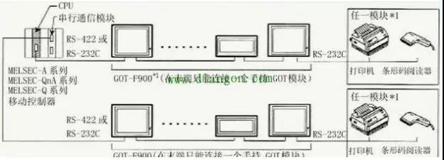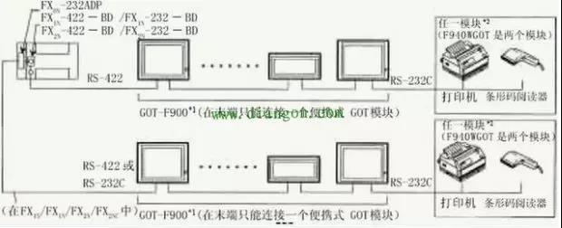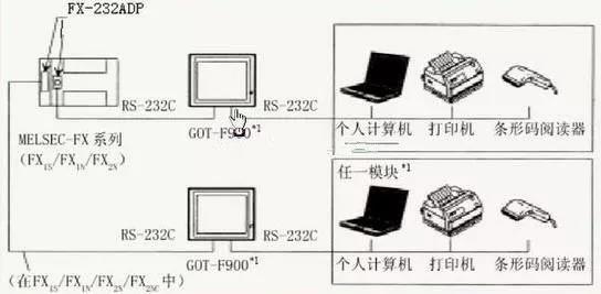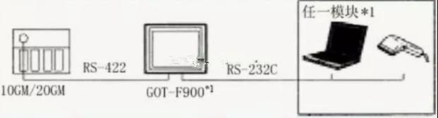 F900GOT (F920GOT-K除外)可以直接和FX定位模塊(10GM/20GM)的編程口(RS—422)相連,通過GOT的RS232C接口,可以和個人計算機、打印機或條碼閱讀器相連。