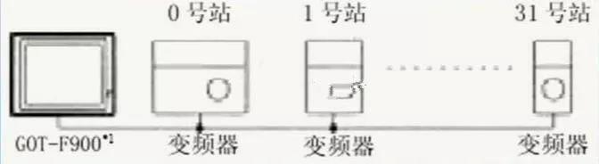 F900GOT (F920GOT-K除外)和FREQROL系列變頻器內(nèi)置的PU端口相連。一臺F900GOT最多可以連接10臺變頻器。