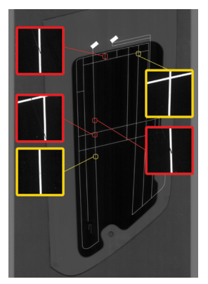 圖4.如果軟件檢測到缺陷或異常,操作員通過HMI顯示屏獲得“光”圖形指示器,并且覆蓋標(biāo)記缺陷的位置,允許操作員放大以進(jìn)行進(jìn)一步檢查。紅色表示失敗,黃色表示警告。