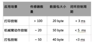 閉環(huán)控制系統(tǒng)不同應用中傳感器數(shù)量、控制周期的時延要求、帶寬要求都有差異,典型來看,周期時間和通信帶寬大小的一些典型值如下: