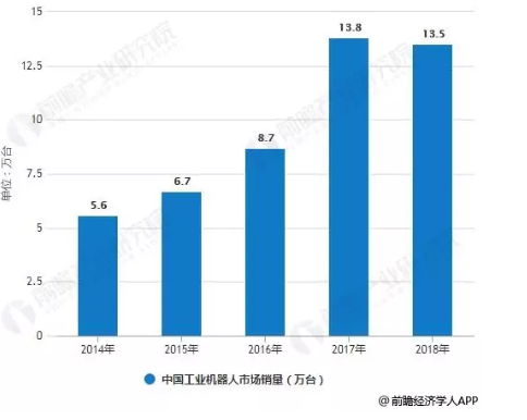 2014-2018年中國(guó)工業(yè)機(jī)器人市場(chǎng)銷(xiāo)量統(tǒng)計(jì)情況