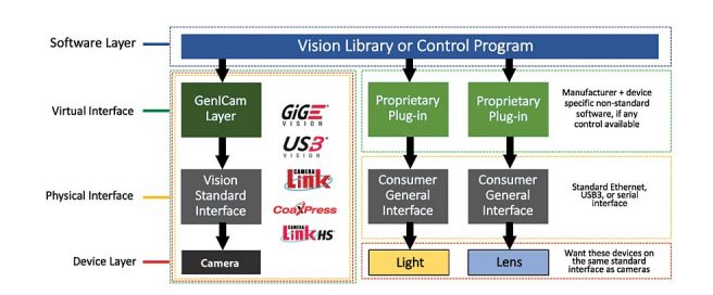 在當今大多數(shù)機器視覺系統(tǒng)中,攝像機、照明和鏡頭系統(tǒng)的實現(xiàn)如圖1所示。相機是通過GenICam和其中一個物理AIA或JIIA標準以標準化的方式實現(xiàn)的。如果有照明或鏡頭控制器,它們很可能使用消費標準版本的千兆以太網(wǎng)或USB接口,并將自己作為第三方定制插件呈現(xiàn)給主機軟件;不是所有三種設(shè)備類型的通用API。