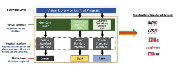 不過,這種情況正在開始改變。在AIA、EMVA和JIIA標準委員會的活動意味著今天有更多的可能。2017年,由Gardasoft、CCS Inc.和Smart Vision Lights公司領(lǐng)導(dǎo)的一個團隊成功地將照明的開端納入GenICam標準。2019年初,一批制造商成立了先進光學集團,并與GenICam委員會接洽,開始增加光學元件。