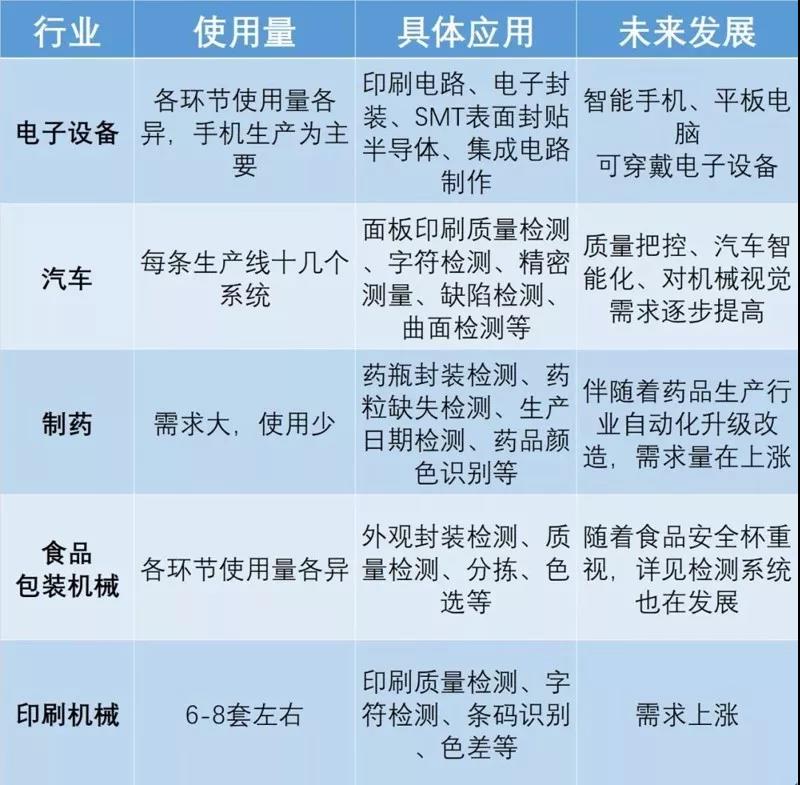 電子、汽車、冶金、食品飲料、零配件裝配及制造等行業(yè)。隨著國(guó)內(nèi)制造業(yè)的快速發(fā)展,對(duì)于產(chǎn)品檢測(cè)和質(zhì)最的要求不斷提高,各行各業(yè)對(duì)圖像和機(jī)器視覺技術(shù)的工業(yè)自動(dòng)需求將越來越大,因此機(jī)器視覺在未來制造業(yè)中將會(huì)有很大的發(fā)展空間。