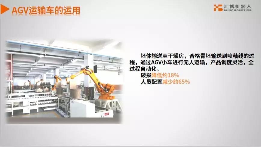 目前東鵬智能工廠工作環(huán)境較改造前有極大改善,項目在噴釉單柜、多工位打磨系統(tǒng)、分檢線、成檢線、立體存儲系統(tǒng)以及AGV小車等多方面進(jìn)行全面升級改造,其中全廠采用自動化高壓成型線10條,六軸工業(yè)機器人約60臺,AGV自動車約55臺,多層自動化輸送線約為5000米;設(shè)備信息化管控系統(tǒng)1套。進(jìn)行升級改造后,東鵬產(chǎn)線效率提升了300%,而員工人數(shù)由原995人減至306人,極大縮減了人工成本,產(chǎn)線上勞動強度大的工作都交給機器人完成,生產(chǎn)全流程均可控。
