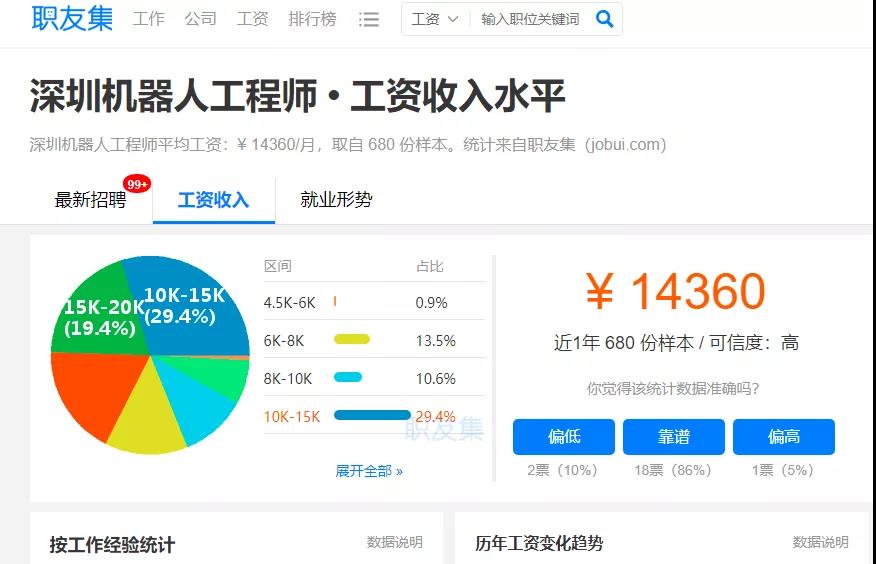 特別伴隨著人工智能、大數(shù)據(jù)等前沿技術(shù)的不斷發(fā)展,機器人(包括移動機器人、智能制造工業(yè)機器人)的使用將越來越普遍。機器人市場發(fā)展迅猛,但是人才培養(yǎng)的速度遠跟不上機器人市場的快速增長速度。人才稀缺也導致行業(yè)人才就業(yè)薪資的高漲。與全國大多數(shù)自動化、傳統(tǒng)制造等工程類崗位相比,機器人工程師崗位的整體薪資都處于工程類領域的領先水平。以深圳為例,機器人工程師崗位的平均薪資14360元。75%以上的工程師月均薪資已過萬元。