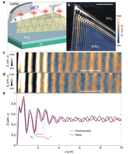 在納米空間分辨超快光譜和成像(tr-SNOM)實驗中(圖1,a),研究者首先將Probe探測光(藍(lán)色)照到原子力顯微鏡(AFM)探針尖端的頂點上,從探針尖端頂點(光束A)散射回的光被離軸拋物面鏡(OAPM)收集并發(fā)送到檢測器。同時,WSe2材料的中的波導(dǎo)被激發(fā)并傳播到樣品邊緣后,進(jìn)而波導(dǎo)被散射到自由空間(光束B)。第二個Pump泵通道(紅色)可均勻地擾動樣本并改變波導(dǎo)的傳播。通過在WSe2/SiO2界面處的近場tr-SNOM的振幅圖像(圖1b)可明顯觀察到約120 nm厚WSe2材料邊緣(白色虛線)處形成的特征周期條紋—光波導(dǎo)電場分布。研究者進(jìn)一步通過定量分析數(shù)據(jù),分別獲取了穩(wěn)態(tài)和光激發(fā)態(tài)下,WSe2中波導(dǎo)的光波導(dǎo)的相速度q1,r和q1,p。