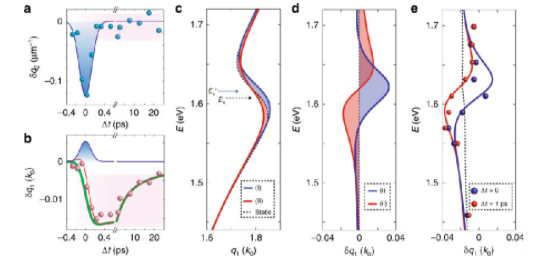 為了弄清各種瞬態(tài)機(jī)制,微分色散關(guān)系被研究者引入。首先,研究者定義了微分關(guān)系:δqj=qj,p – qj,r,(j=1,2 分別代表波矢的實部和虛部,p, pump激發(fā)態(tài),r 穩(wěn)態(tài))。研究者的理論及實驗微分色散關(guān)系結(jié)果(圖3 d、e)成功顯示了光誘導(dǎo)轉(zhuǎn)變中A-exciton的動力學(xué)行為。結(jié)果表明:A-exciton附近微分色散的特征是由兩個伴隨效應(yīng)引起的:(i)僅在Δt=0時觀察到的A-exciton的7 meV藍(lán)移;(ii)A-exciton的漂白(定義為光譜頻譜展寬和/或振蕩強(qiáng)度降低(見圖3d)。趨勢(i)在1 ps內(nèi)恢復(fù),與抑制耗散的動力學(xué)一致(圖3a)。因此,研究者得出結(jié)論,A-exciton共振的瞬態(tài)藍(lán)移是由于相干的光誘導(dǎo)過程所引起。趨勢(ii)持續(xù)時間更長,因此歸因于非相干激子動力學(xué)。