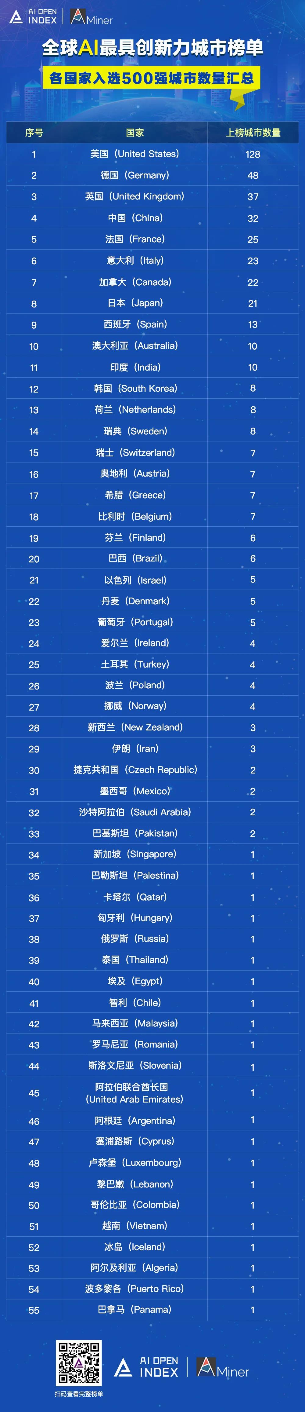 發(fā)現(xiàn)全球最具創(chuàng)新力城市探索 2020 年 AI 城市榜單2020 年全球 AI 城市榜單從全球近 2000 個(gè)城市中遴選了前 500 個(gè)最具人工智能創(chuàng)新力城市,共覆蓋了 55 個(gè)不同的國家和地區(qū)。下圖是 55 個(gè)國家入選 500 強(qiáng)城市的數(shù)目匯總。