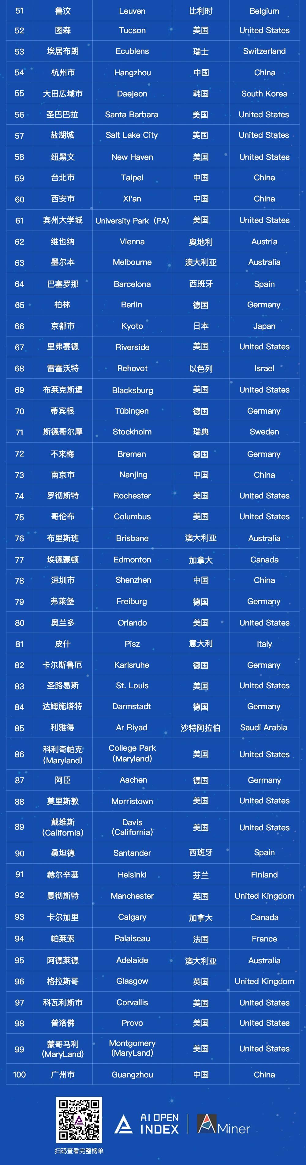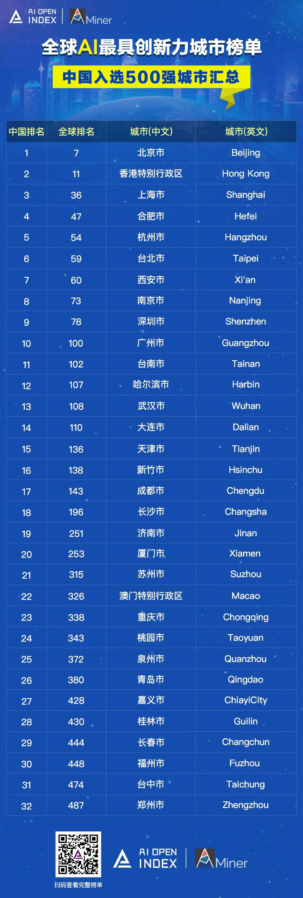 在今年的 Top 500 全球 AI 創(chuàng)新城市中,中國有 32 個(gè)城市上榜,分別是:北京市,香港特別行政區(qū),上海市,合肥市,杭州市,臺(tái)北市,西安市,南京市,深圳市,廣州市,臺(tái)南市,哈爾濱市,武漢市,大連市,天津市,新竹市,成都市,長沙市,濟(jì)南市,廈門市,蘇州市,澳門特別行政區(qū),重慶市,桃園市,泉州市,青島市,嘉義市,桂林市,長春市,福州市,臺(tái)中市,鄭州市。下圖是中國入選 500 強(qiáng)城市匯總清單。