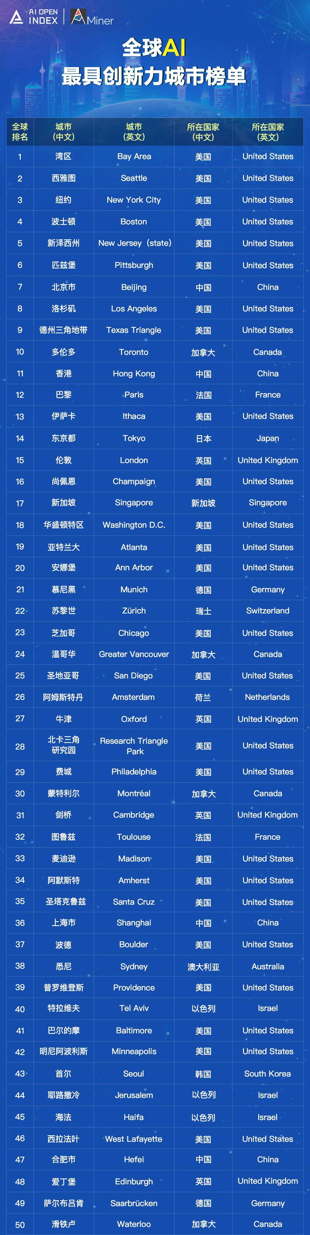 全球人工智能最具創(chuàng)新力城市榜單發(fā)布,中國32個(gè)城市進(jìn)入世界500強(qiáng)