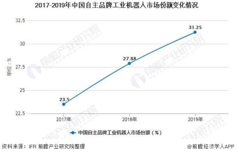 雖然我國工業(yè)機器人市場目前仍以外資品牌機器人為主,但近年來,隨著我國在機器人領域的快速發(fā)展,我國自主品牌工業(yè)機器人市場份額也在逐步提升,與外資品牌機器人的差距在逐步縮小。2019年,自主品牌工業(yè)機器人在市場總銷量中的比重為31.25%,比上年提高3.37個百分點。