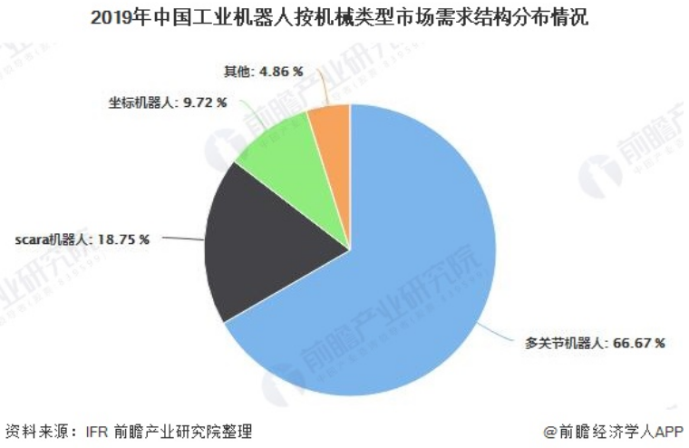 從機械結構看,2019年多關節(jié)機器人在中國市場中的銷量在各機型中依然位居首位,全年銷售近9.6萬臺,占總銷量的66.67%,銷量同比下降2.3%,是自2013年來銷量首次出現同比負增長;