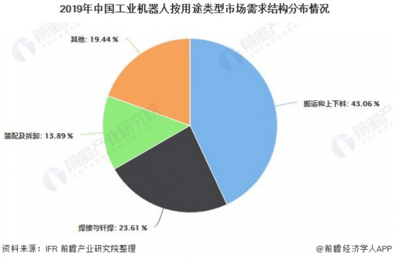 其中,搬運和上下料作為首要應用領域,2019年銷售6.2萬臺,同比下降4.4%,在總銷量中的比重提高至43.06%;焊接與釬焊機器人銷售3.4萬臺,同比下降16%,占比為23.61%;裝配及拆卸機器人銷售2萬臺,同比下降16.7%,占比為13.89%;加工領域機器人銷售同比增長105.5%,是唯一實現銷量增長的應用領域。