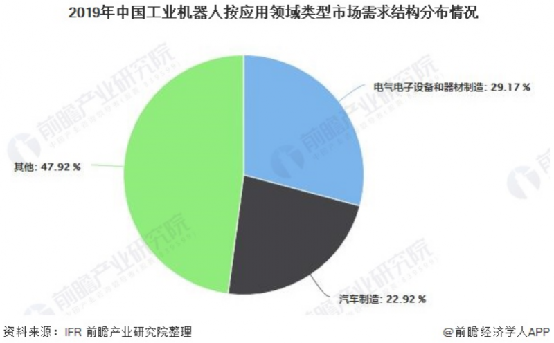 從應用行業(yè)看,電氣電子設備和器材制造連續(xù)第四年成為中國市場的首要應用行業(yè),2019年銷售超過4.2萬臺,同比下降8.9%,占中國市場總銷量的29.17%;汽車制造業(yè)仍然是十分重要的應用行業(yè),2019年采購機器人3.3萬臺,銷量在上年的基礎上繼續(xù)下降17.1%,在中國市場總銷量的比重下降至22.92%。