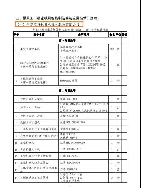 匯博機(jī)器人為本次大賽中的3個(gè)賽項(xiàng)提供設(shè)備與技術(shù)支持,這3個(gè)賽項(xiàng)分別為物聯(lián)網(wǎng)安裝調(diào)試員(智能制造數(shù)字技術(shù)應(yīng)用)賽項(xiàng)、模具工(精密模具智能制造系統(tǒng)應(yīng)用技術(shù))賽項(xiàng)、電工(智能制造單元生產(chǎn)與管控)賽項(xiàng)。