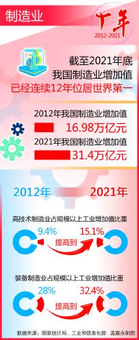 制造業(yè)是立國(guó)之本、興國(guó)之器、強(qiáng)國(guó)之基。黨的十八大以來(lái),我國(guó)制造業(yè)大國(guó)地位進(jìn)一步鞏固,重點(diǎn)領(lǐng)域不斷取得突破,產(chǎn)業(yè)結(jié)構(gòu)優(yōu)化持續(xù)加快。一批有世界影響力的優(yōu)勢(shì)產(chǎn)業(yè)引領(lǐng)創(chuàng)新;一批世界卓越的大型企業(yè)和制造業(yè)單項(xiàng)冠軍企業(yè)不斷涌現(xiàn);一批世界級(jí)先進(jìn)制造業(yè)集群加快形成……國(guó)家統(tǒng)計(jì)局、工業(yè)和信息化部的數(shù)據(jù)顯示,2012年至2021年,我國(guó)制造業(yè)增加值從16.98萬(wàn)億元增長(zhǎng)到31.4萬(wàn)億元。高技術(shù)制造業(yè)、裝備制造業(yè)占規(guī)模以上工業(yè)增加值的比重分別從2012年的9.4%、28%提高到2021年的15.1%、32.4%。截至2021年底,我國(guó)制造業(yè)增加值已經(jīng)連續(xù)12年位居世界第一。中國(guó)制造正向中國(guó)創(chuàng)造大步邁進(jìn)。