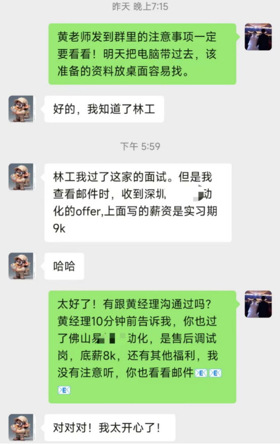 后面的談薪環(huán)節(jié)也和就業(yè)經(jīng)理一起溝通了一下,順利接到3家企業(yè)的電氣工程師、電氣助理工程師、售后調(diào)試郵件offer,其中我選擇了深圳一家做整廠設(shè)計方案的乙方企業(yè),崗位是電氣工程師。實(shí)習(xí)期9K。這個薪資我還是比較滿意的,而且不得不說,剛畢業(yè)就能找到工作的感覺,真的賊好!這些是犀靈機(jī)器人帶給我的能力、勇氣和底氣。