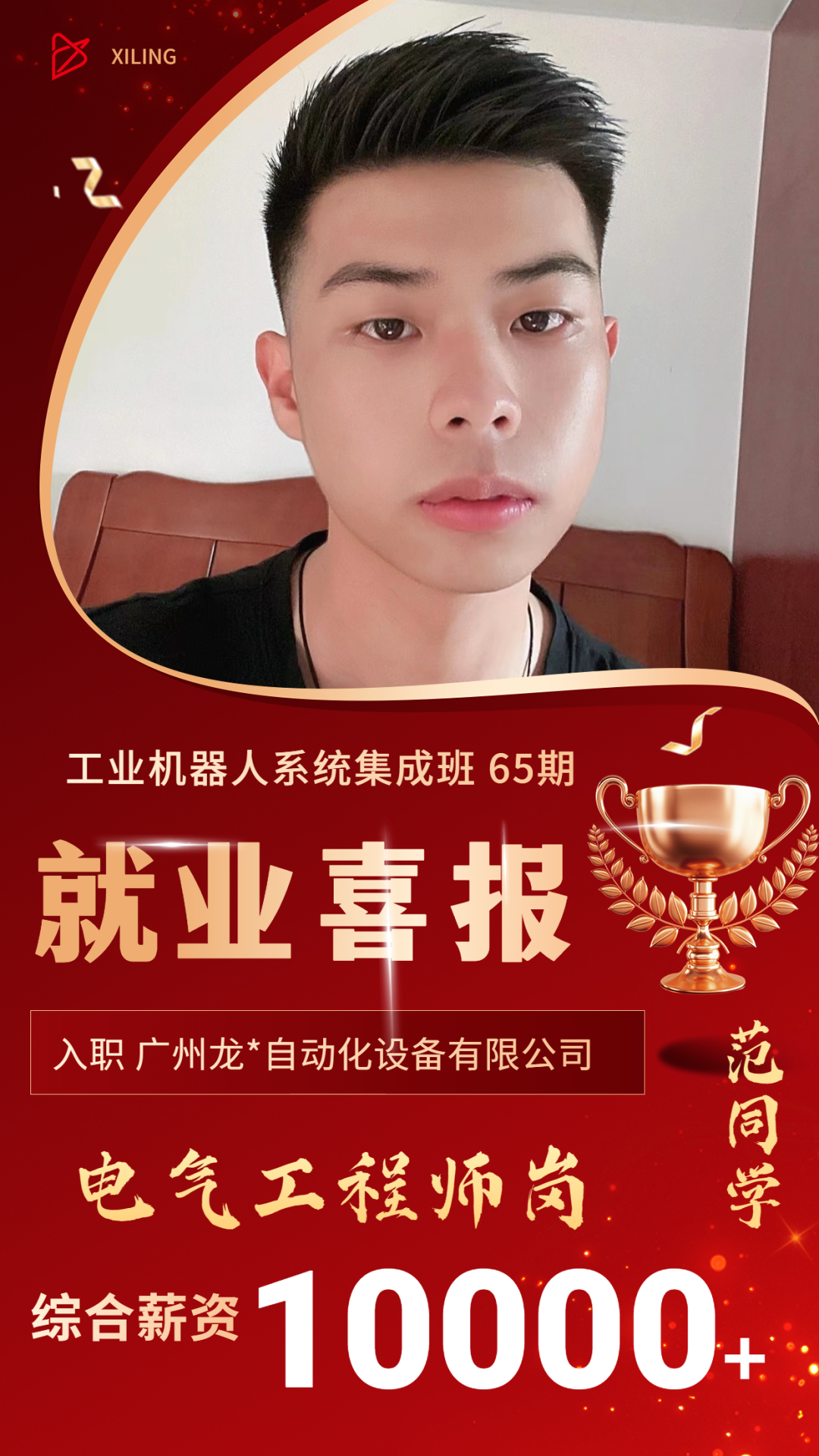 經(jīng)過(guò)犀靈機(jī)器人的培訓(xùn)后,范同學(xué)成功找到了一份實(shí)習(xí)電氣工程師的崗位,加入了廣州龍*自動(dòng)化設(shè)備有限公司。他的實(shí)習(xí)薪資包括固定工資和加班費(fèi),大約為7,000至8,000元。現(xiàn)在已經(jīng)轉(zhuǎn)正了,薪資在1W+,在這個(gè)崗位上,他主要從事PLC編程和機(jī)器人相關(guān)工作。