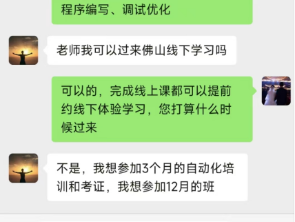 “這3個月以來,我沒有玩過游戲一天”,這是我參加結(jié)業(yè)典禮說得最多的一句話!結(jié)業(yè)后的第一周內(nèi),我已經(jīng)收到2份offre邀請(我們班大部分學(xué)員在完成集成任務(wù)前已經(jīng)投遞和被安排面試)。經(jīng)過和就業(yè)老師以及同家人商量,我決定入職佛山南*智能裝備有限公司助力電氣工程師,起薪7K/月,入職要求是:熟悉各種電路及三菱、歐姆龍、西門子PLC編程,有一定的程序語言能力(C++)可以單獨(dú)處理發(fā)那科/ABB及國產(chǎn)機(jī)器人與PLC總控系統(tǒng)的應(yīng)用程序等。崗位職責(zé)是負(fù)責(zé)現(xiàn)場設(shè)備調(diào)試、陪同上級根據(jù)甲方要求設(shè)計整廠自動化/半自動化工藝流程等事宜。3年過去了,也就是2023年10月,我從入職時的助理崗轉(zhuǎn)到現(xiàn)在的項目調(diào)試工程師,負(fù)責(zé)公司項目的現(xiàn)場指導(dǎo)安裝施工工作,薪資也從最初7K/月提升到14K/月。