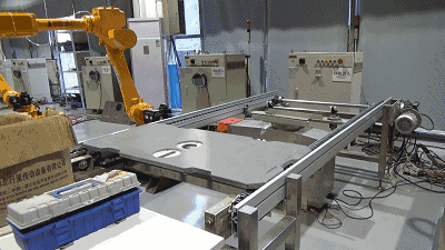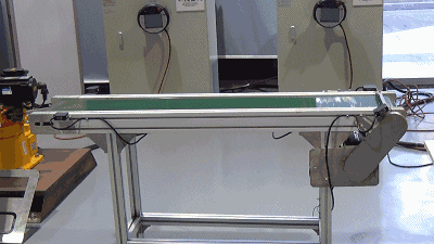 與兩臺(tái)機(jī)器人實(shí)現(xiàn)聯(lián)動(dòng)的流水線▼