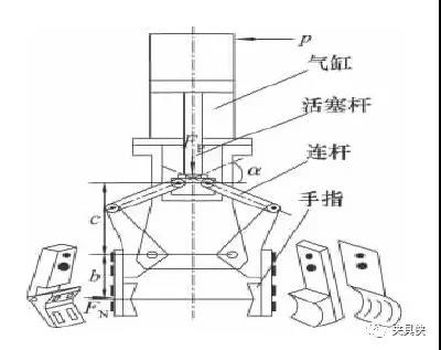 一般由單作用雙聯(lián)氣缸與交叉式指部構(gòu)成。氣體進(jìn)入氣缸的中間腔后,會(huì)推動(dòng)兩個(gè)活塞往兩邊運(yùn)動(dòng),從而帶動(dòng)連桿運(yùn)動(dòng),交叉式指端便會(huì)將工件牢牢固定;如果沒有空氣進(jìn)入中間腔體,活塞會(huì)在彈簧推力的作用下復(fù)位,固定的工件會(huì)被松開。