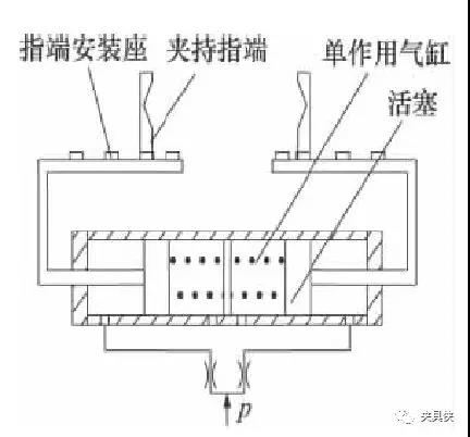 這種夾持機(jī)構(gòu)的指端通常安裝于配備有指端安裝座的直桿上,當(dāng)壓力氣體進(jìn)入單作用式雙氣缸的兩個(gè)有桿腔時(shí),會(huì)推動(dòng)活塞逐漸向中間移動(dòng),直至將工件夾緊。