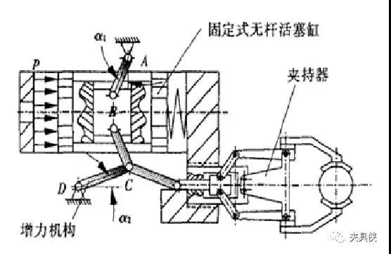圖7 固定式無(wú)桿活塞缸驅(qū)動(dòng)的增力機(jī)構(gòu)