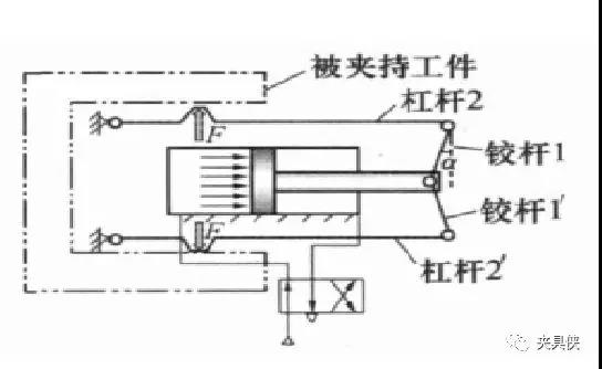當(dāng)壓縮空氣的方向控制閥處于圖所示左位工作狀態(tài)時(shí),氣壓缸的左腔即無(wú)桿腔進(jìn)入壓縮空氣,活塞將在空氣壓力的作用下向右運(yùn)動(dòng),使鉸桿壓力角α逐漸減小,借助角度效應(yīng)將空氣壓力放大,接著將力傳到恒增力杠桿機(jī)構(gòu)杠桿上,作用力將被再一次放大,變?yōu)閵A持工件的作用力 F。當(dāng)方向控制閥處于右位工作狀態(tài)時(shí),氣壓缸的右腔即有桿腔進(jìn)入壓縮空氣,推動(dòng)活塞向左運(yùn)動(dòng),夾持機(jī)構(gòu)松開工件。